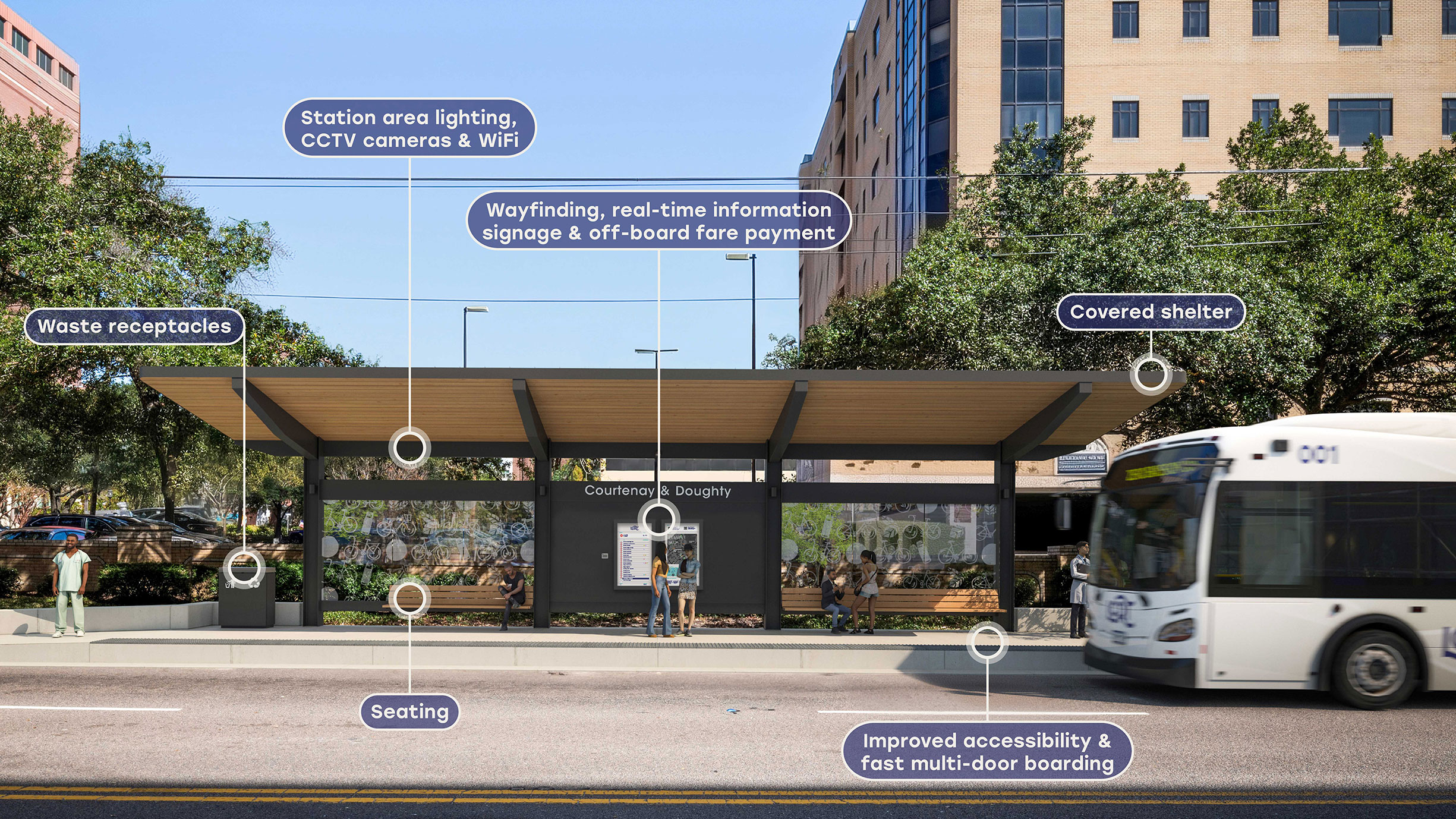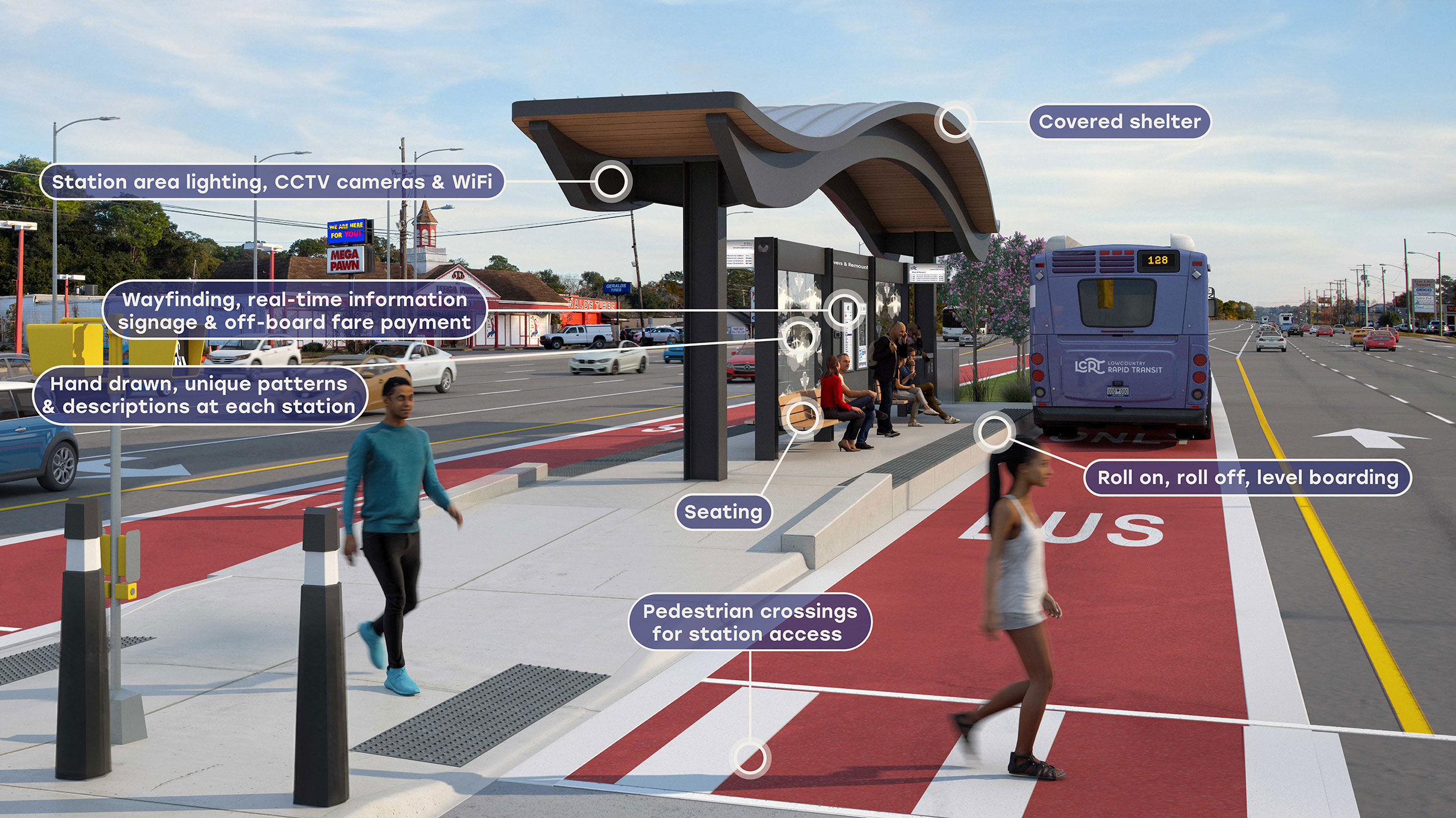 Hover over the dots on the image below to see all the unique features that will be included in LCRT stations.